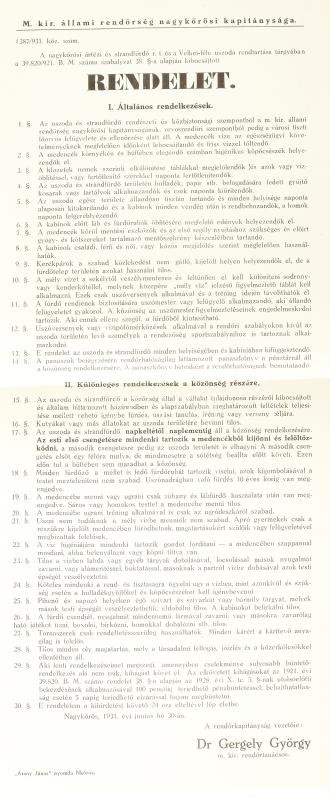 Beschreibung: 1931 Nagykőrös artézi és strandfürdő rt. és a Velkei-féle uszoda rendtartása tárgyában kibocsájtott rendelet. Falragasz 21x48 cm