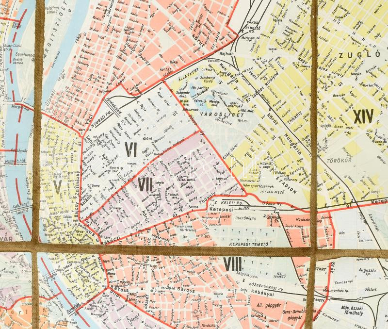 cca 1950 Budapest térképe, kiadja: Honvéd Sajtó és Lapkiadó Vállalat, 1 : 33.000, Bp., Offset-ny., vászonra kasírozva, kissé viseltes állapotban, 110x86 cm