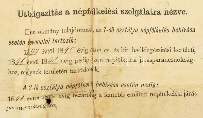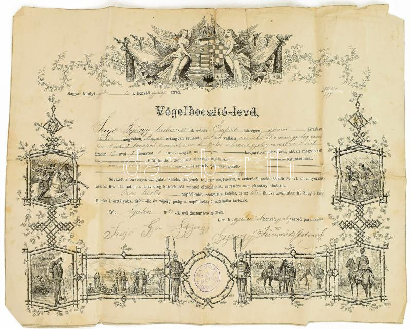 1893 Katonai végelbocsájtó levél kürtös részére. 48x39 cm Gyűrődésekke... https://www.darabanth.com/de/465-Fernauktion/465.0/Kunst-Dokumente-andere-Sammelgebiete/Militaria~1000008/1893-Katonai-vegelbocsajto-level-kurtos-reszere-48x39-cm-Gyurodesekkel~II3138550