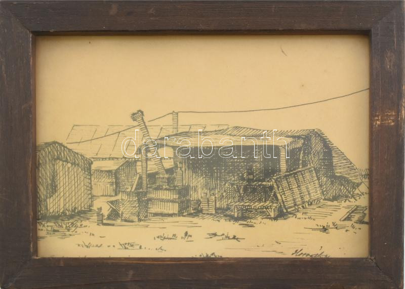 Beschreibung: cca 1918 Horváth jelzéssel: Emblingi fogolytábor képeslap ofszet papír, üvegezett keretben