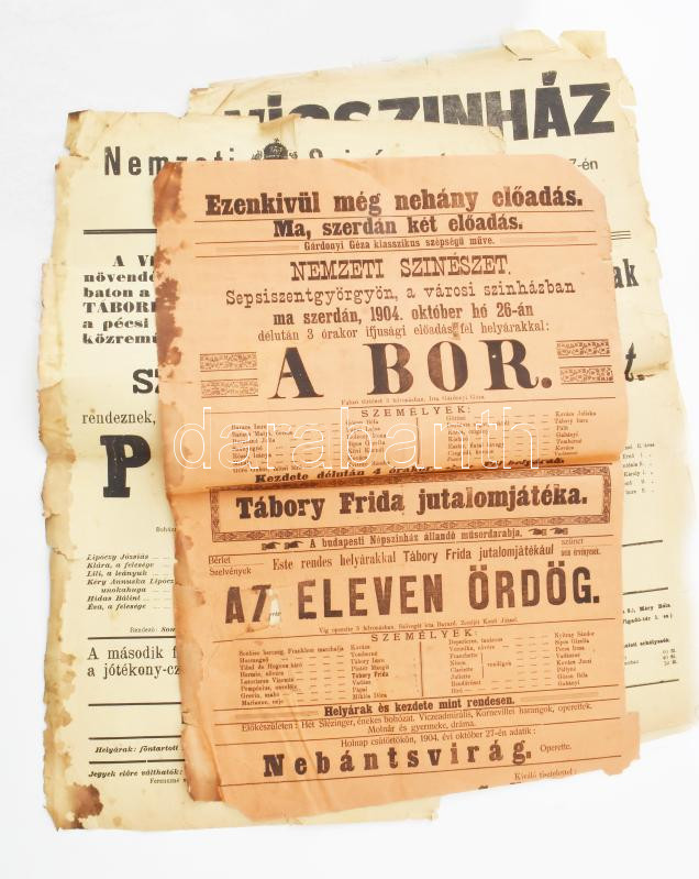 cca 1902-1904 Antik színházi plakátgyűjtemény, össz. 6 db: Sepsiszentgyörgy, Zombor, Kőbánya, Bp. Vígszínház (végzős növendékek előadása) stb., foltos és sérült, 43x30 cm körüli méretekben
