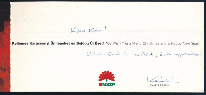 Beschreibung: Kovács László (1939- ) szocialista politikus, volt külügyminiszter, az MSZP volt elnökének autográf aláírása és sorai újévi üdvözlőlapon