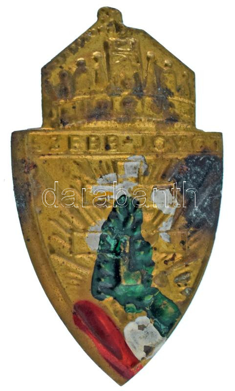 Beschreibung: ~1940. "Szebb Jövőt" tombak levente lemez sapkajelvény, részben festett (56x32mm) T:XF,VF patina