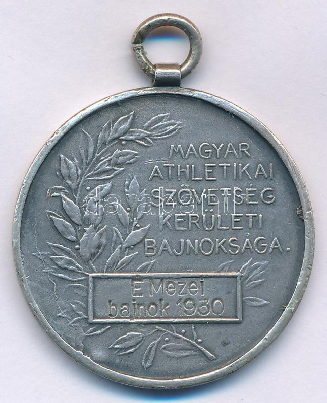 1930. "Magyar Athletikai Szövetség Kerületi Bajnokság - E Mazei bajnok 1930" kétoldalas jelzett Ag díjérem füllel és gravírozással, " "S.G.A. (Scheid Ezüstáru- és Éremgyár)" gyártói jelzéssel (18,88g/0.800/35mm) T:XF patina