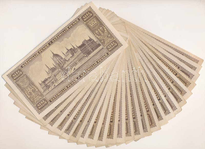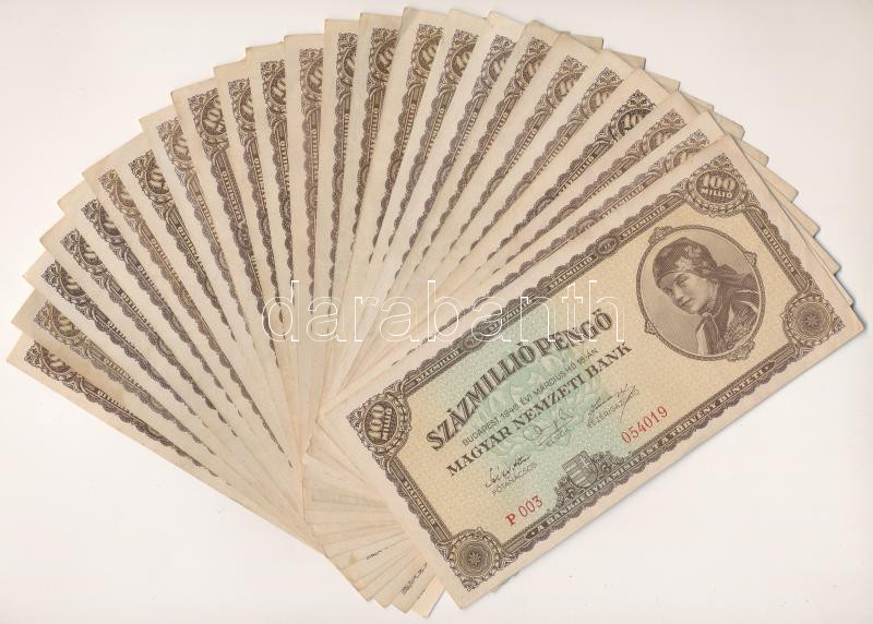 1946. 100.000.000P (24x) mind különféle sorozatszámmal "P 003 - P 327"... https://www.darabanth.com/de/465-Fernauktion/465.0/Numismatik/Ungarische-Banknoten~2500009/1946-100000000P-24x-mind-kulonfele-sorozatszammal-P-003-P-327-kozott-T-F-szep-papirAdamo~II3136086