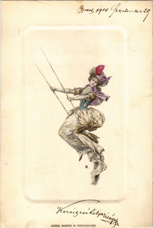1900 Lady art postcard, swing. Szénásy, litho (fl) https://www.darabanth.com/de/466-Fernauktion/466.0/Ansichtskarten/Damen~2000038/1900-Lady-art-postcard-swing-Szenasy-litho-fl~II3142520