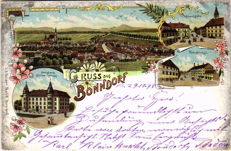 Beschreibung: 1898 (Vorläufer) Bonndorf, Rathausplatz, Neustrasse, Amtshaus (Ehemal Schloss) / town hall, street, square, castle. J.A. Binder Art Nouveau, floral, litho