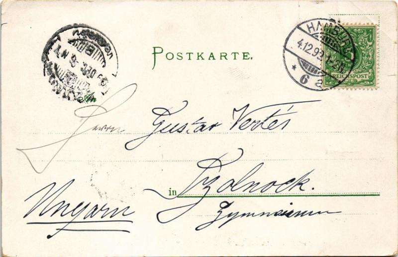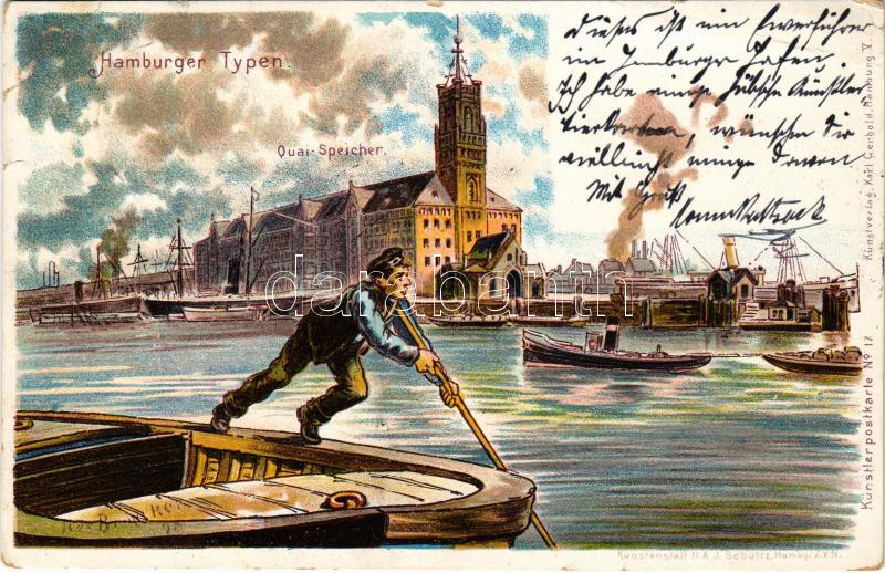 Beschreibung: 1899 (Vorläufer) Hamburg, Hamburger Typen. Quai Speicher / quay. Karl Gerhold Künstlerpostkarte No. 17. litho (EB)