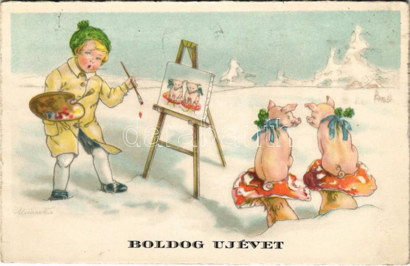 1939 Boldog Újévet / New Year greeting art postcard, painter with pigs... https://www.darabanth.com/de/466-Fernauktion/466.0/Ansichtskarten/GruC39Fkarten-Feste~2000088/1939-Boldog-Ujevet-New-Year-greeting-art-postcard-painter-with-pigs-fl~II3143080
