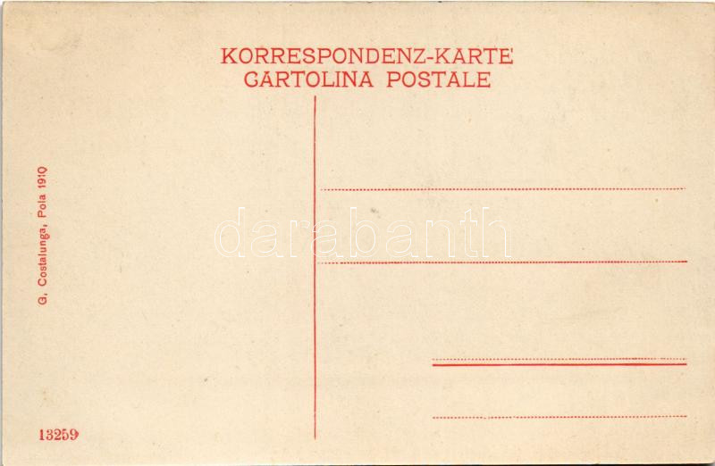 Beschreibung: SMS BUDAPEST Osztrák-Magyar Haditengerészet Monarch-osztályú partvédő csatahajó matrózai zászlóval a fedélzeten / K.u.K. Kriegsmarine Matrosen / Austro-Hungarian Navy, Monarch-class coastal defense ship's mariners on deck with flag. G. Costalunga Pola 1910.