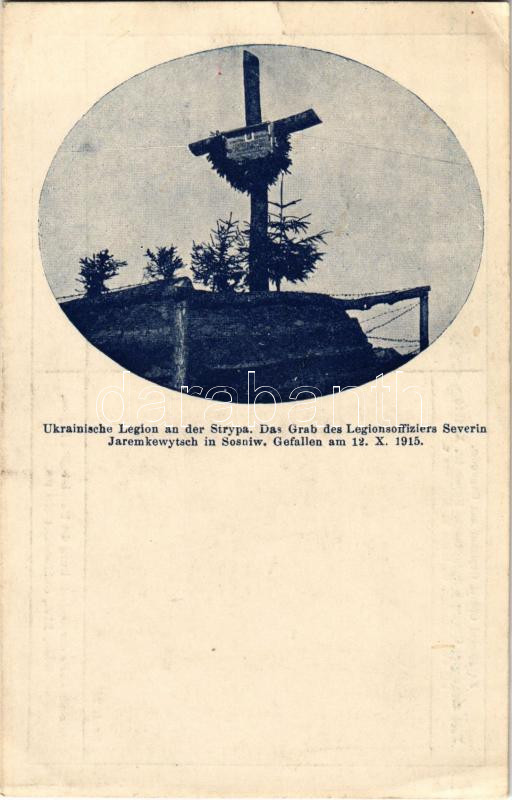 Ukrainische Legion an der Strypa. Das Grab des Legionsoffiziers Severin Jaremkewytsch in Sosniw. Gefallen am 12. X. 1915. Offizielle Karte der Zentralleitung der Ukrainischen Legion / WWI K.u.K. military, Ukrainian Legion officer's grave (EK)