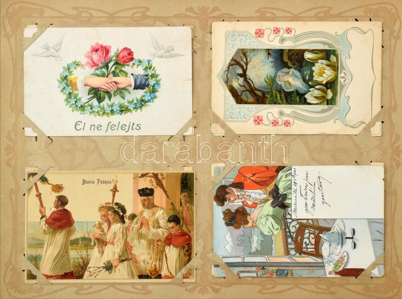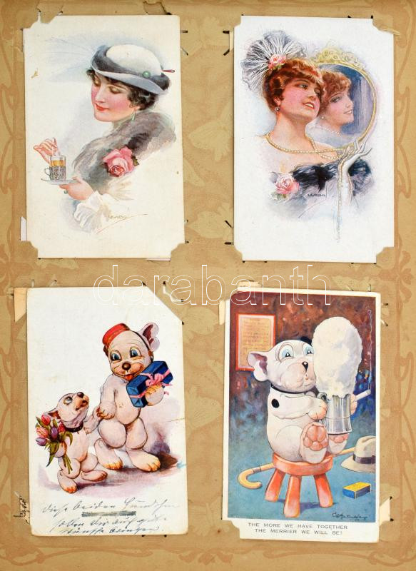 38x22 cm-es, vászon borítású, régi, nyomott, aranyozott festett 192 férőhelyes albumban 192 régi képeslap (1899-1945) motívumlap, kevés topográfiával, sok litho, szecessziós és art deco lapok, hölgyek, gyerek, művészlapok /Innocent, Munkácsy/ fotólapok, erotikus lapok, sok szignós lap Balestrini, Auer, Wichera, Gert Kalous, Harrison, Boileau, Corbella Usabal, Anichini, Manni Grosze, Solomko, Trübe, Mabel Lucie Atwell lapok, Pauli Ebner, humor, törpe, hóember, olasz art deco lapok - szignó nélküli Bertigliák, árnyképes romantikus lapok, Bonzo kutyás lapok, hímzéses lap, kézzel festett lap, Wagner lap, Jeanne d'Arc lapok, híres emberek, militária