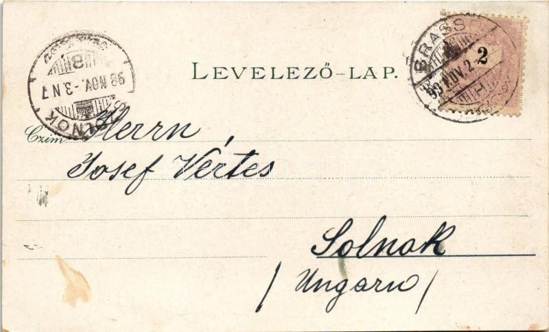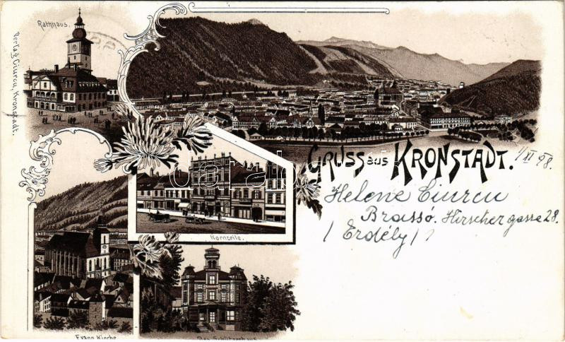 1898 (Vorläufer!) Brassó, Kronstadt, Brasov; Városháza, Búzasor, Evangélikus templom, Lövészház / Rathhaus, Kornzeile, Kirche, Schützenhaus / town hall, church, square, shooting hall. Art Nouveau, floral, litho