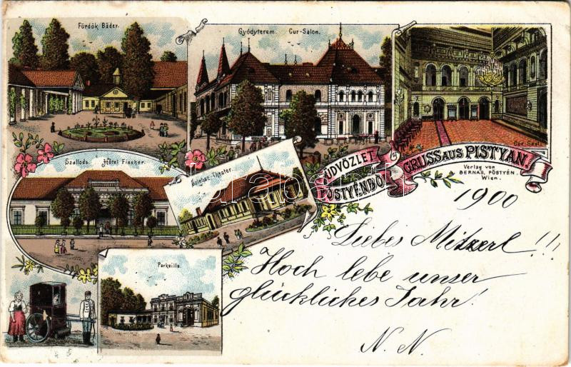 1900 Pöstyén, Piestany; Fürdők, Gyógyterem, Színház, Fischer szálloda, Parkvilla / Bäder, Cur-Salon, Theater, Hotel Fischer / spa, baths, theatre, hotel, villa. Art Nouveau, floral, litho (EK)