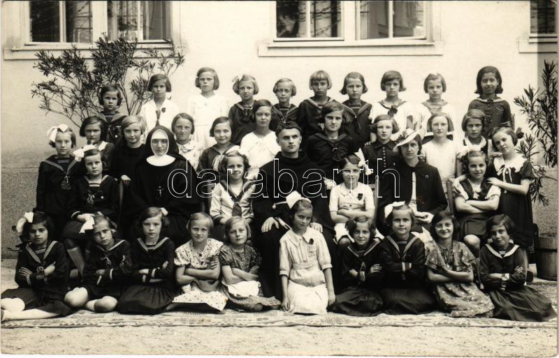 Beschreibung: 1936 Érsekújvár, Nové Zámky; leány iskola, csoportkép. Kováts Fotograf / girl school, students' group photo