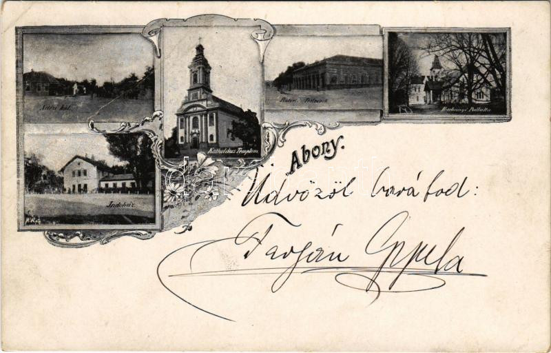 Beschreibung: 1898 (Vorläufer) Abony, Indóház, Vasútállomás, Artézi kút, Katolikus templom, Harkányi palota, kastély, Pintér Testvérek üzlete. Art Nouveau, floral (EB)