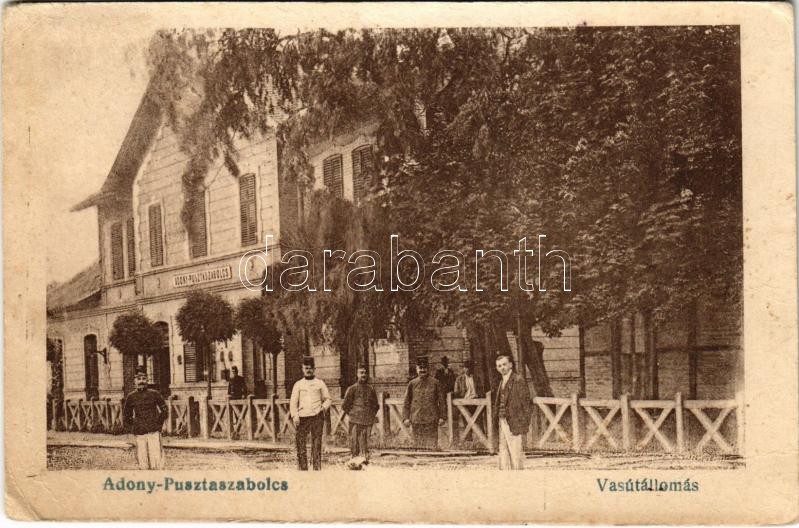 1918 Adony-Pusztaszabolcs, vasútállomás. Vasúti levelezőlapárusítás 79... https://www.darabanth.com/de/466-Fernauktion/466.0/Ansichtskarten/Ungarn~2000005/1918-Adony-Pusztaszabolcs-vasutallomas-Vasuti-levelezolaparusitas-7903-EK~II3142354