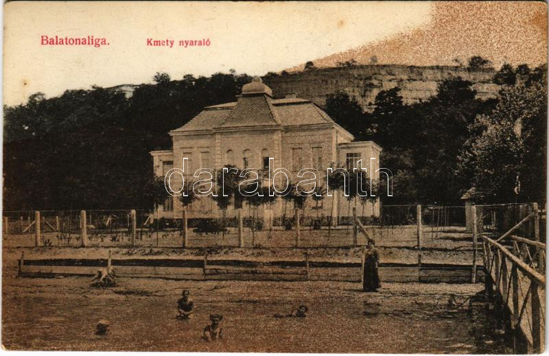 Beschreibung: Balatonaliga (Balatonvilágos), Kmety nyaraló, villa, fürdőzők. Novák Jenő kiadása (fl)