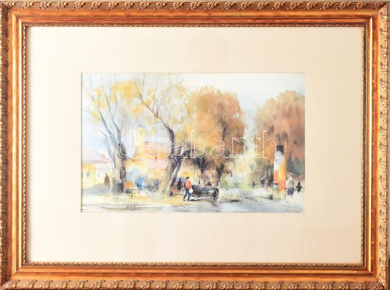Beschreibung: Szalóky Sándor (1921-1978): Őszi park. Akvarell, papír, jjl.: Szalóky S. 29x46 cm, keretben, üvegezett, jó állapotú.