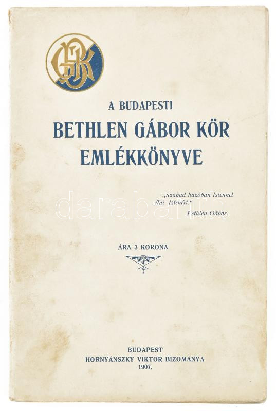 1907 A Bethlen Gábor kör emlékkönyve. Bp., 1907. Hornyánszky 180 p. Ki... https://www.darabanth.com/de/466-Fernauktion/466.0/Bucher/Bucher-Andere-kuriositaten~500042/1907-A-Bethlen-Gabor-kor-emlekkonyve-Bp-1907-Hornyanszky-180-p-Kiadoi-papirkotesben~II3088740