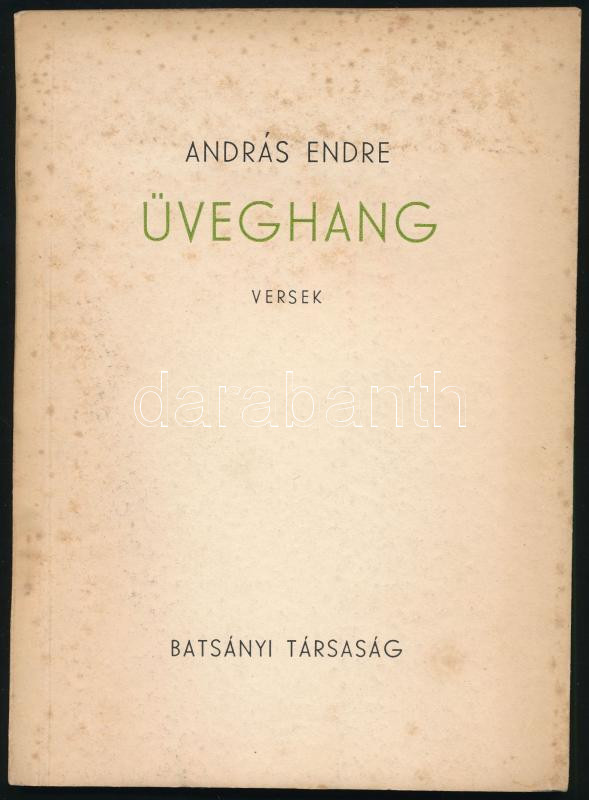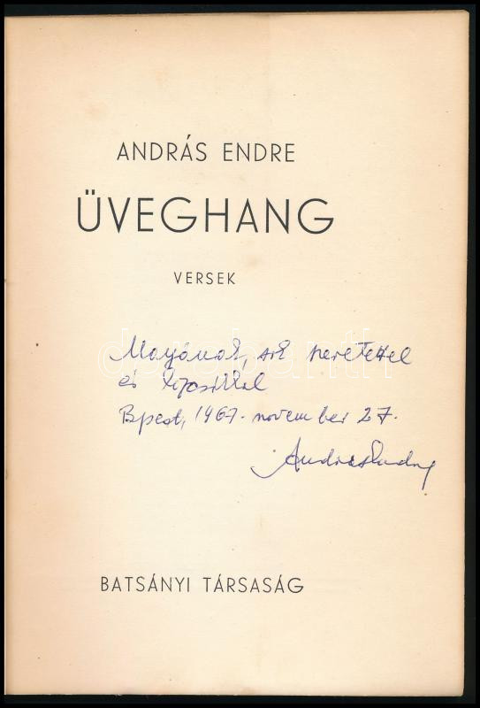 András Endre: Üveghang. Versek. (DEDIKÁLT). (Pécs), [1947], Batsányi Társaság (Kultúra-ny.), 54+(2) p. Első kiadás. A költő egyetlen nyomtatásban megjelent kötete. Kiadói papírkötés, foltos borítóval, egyébként jó állapotban. A szerző, András Endre (1918-1998) író, költő, újságíró által DEDIKÁLT példány.