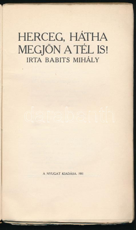 Babits Mihály: Herceg, hátha megjön a tél is! Bp., 1911., Nyugat, (Világosság-ny.), 104+6 p. Első kiadás. A borító Falus Elek munkája. Kiadói papírkötés, kissé sérült, szakadt borítóval, a gerincen hiánnyal,