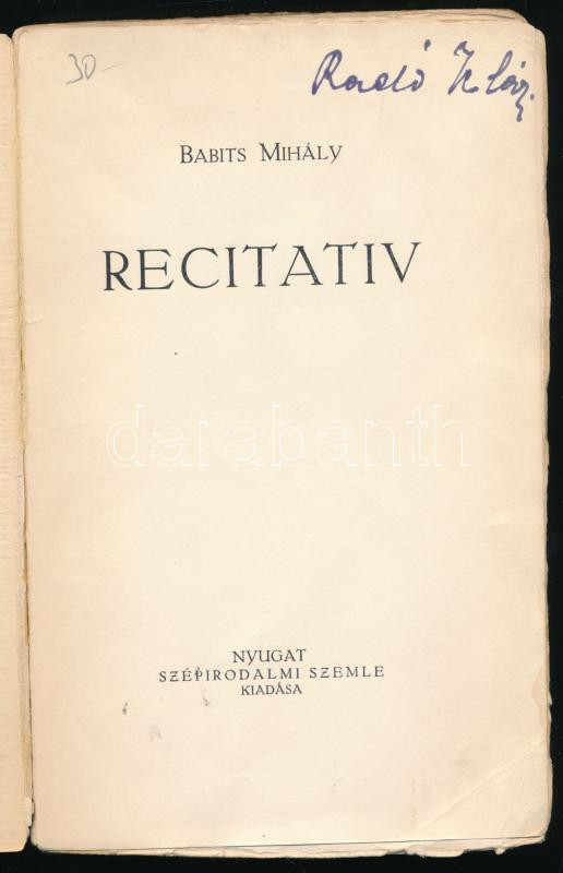 Babits Mihály: Recitativ. Bp., 1916, Nyugat Szépirodalmi Szemle. 131+5 p. Első kiadás. A borítón Falus Elek (1884-1950) grafikus illusztrációjával. Kissé sérült kiadói papírkötés, tulajdonosi névbejegyzéssel
