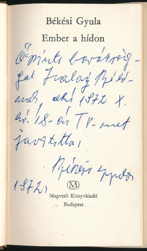 Békési Gyula: Ember a hídon. (DEDIKÁLT). Bp., 1972, Magvető. Első kiadás. Kiadói egészvászon-kötés, kiadói papír védőborítóban. A szerző, Békési Gyula (1924-2003) József Attila-díjas költő által DEDIKÁLT példány.