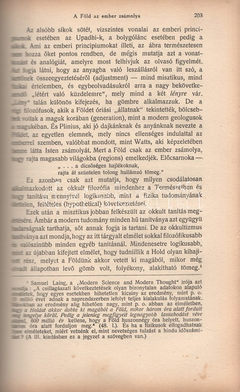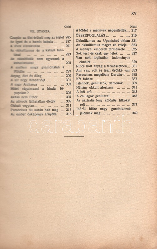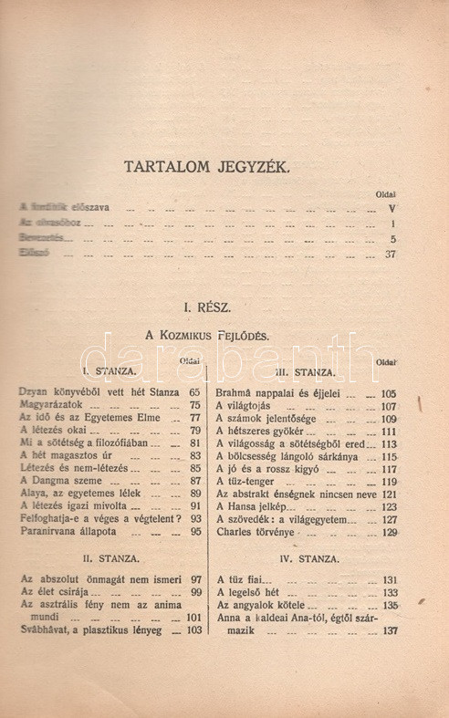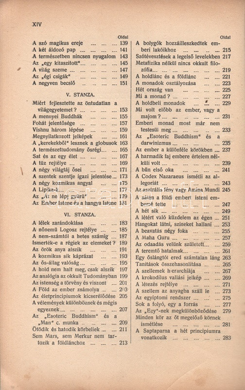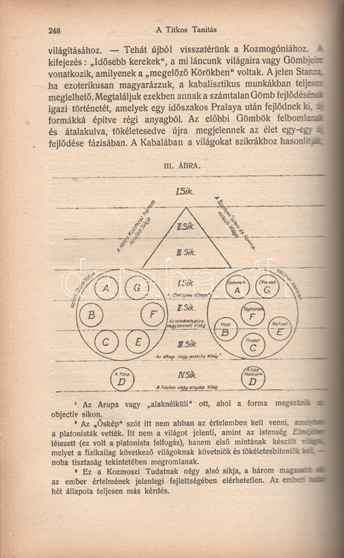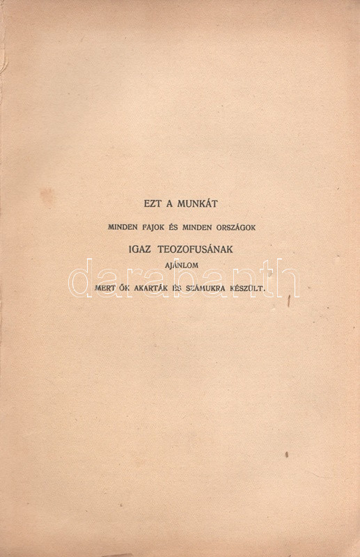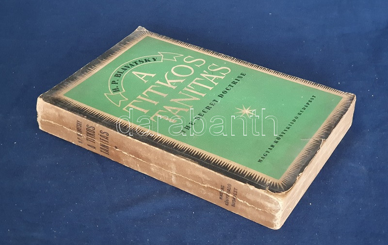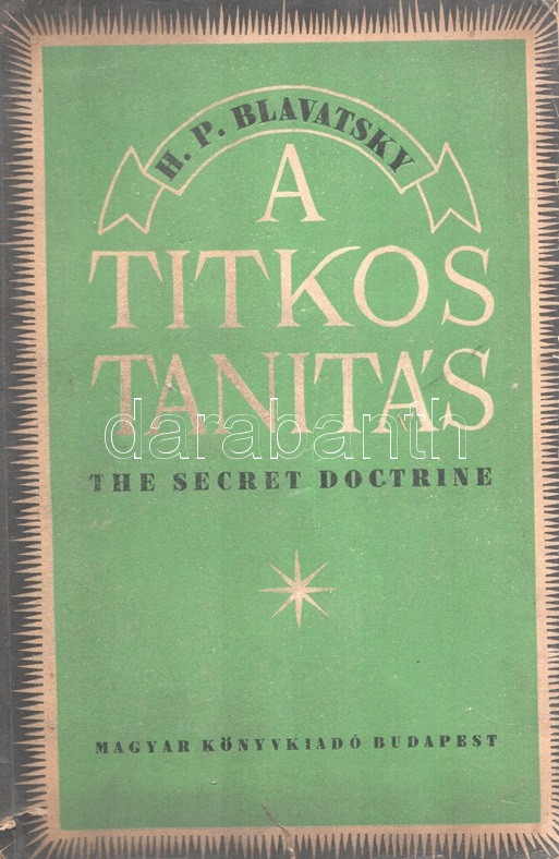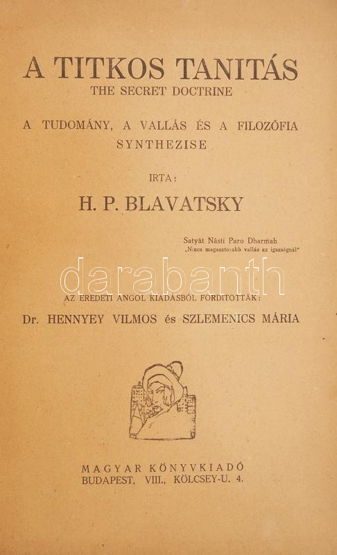 Blavatsky, H[elena] P[etrovna]: A titkos tanÃtás. The Secret Doctrine. A tudomány, a vallás és a filozófia synthezise. Az eredeti angol kiadásból fordÃtották Hennyey Vilmos és Szlemenics Mária. Budapest, [1944]. Magyar Könyvkiadó (Arany János Rt. ny.) XV + [1] + 350 p. Jelena Petrovna Blavatszkaja, ismertebb nevén Madame Blavatsky (1831-1891) orosz teozófus, ÃrónÅ‘, a nemzetközi Teozófiai Társaság egyik alapÃtója. FÅ‘ műve, az okkult teozófia tudásanyagát tömörÃtÅ‘ kötete eredeti nyelven 1888-ban jelent meg, ,,The Secret Doctrine" cÃmmel. ElsÅ‘ magyar fordÃtása 1928-ban jelent meg. Néhány oldalon apró foltosság. Fűzve, szÃnes, illusztrált, enyhén sérült kiadói borÃtóban.