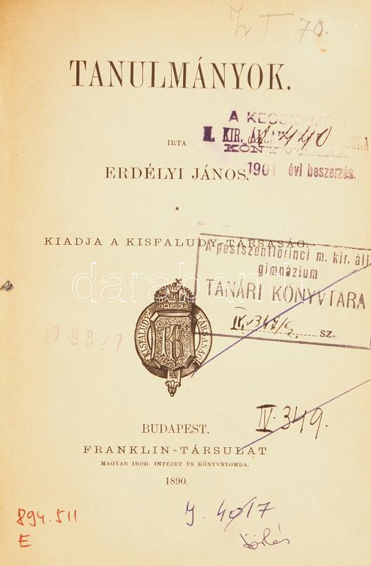 Erdélyi János: Tanulmányok. Bp., 1890, Franklin, 539+3 p. Átkötött fél... https://www.darabanth.com/de/466-Fernauktion/466.0/Bucher/Bucher-Andere-kuriositaten~500042/Erdelyi-Janos-Tanulmanyok-Bp-1890-Franklin-539plus3-p-Atkotott-felvaszon-kotes-regi-~II3149635