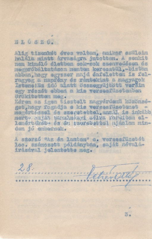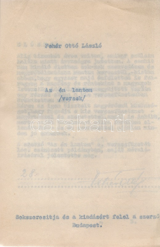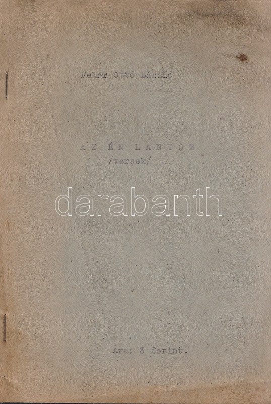 Fehér Ottó László: Az én lantom. Versek. [Számozott, aláírt.] Budapest, [é. n.]. Szerző - szerzői sokszorosítás. 11 + [1] p. Egyetlen kiadás. Összesen száz példányban megjelent kötet aláírt, számozott példánya, sorszáma: 28. A könyvészetileg ismeretlen kiadvány 1950 között készülhetett a szerző írógépén, erre utal a füzet elején olvasható, forintban meghatározott fogyasztói ár. Fűzve, kiadói borítóban. Nagyon ritka.