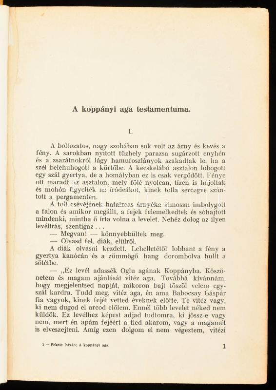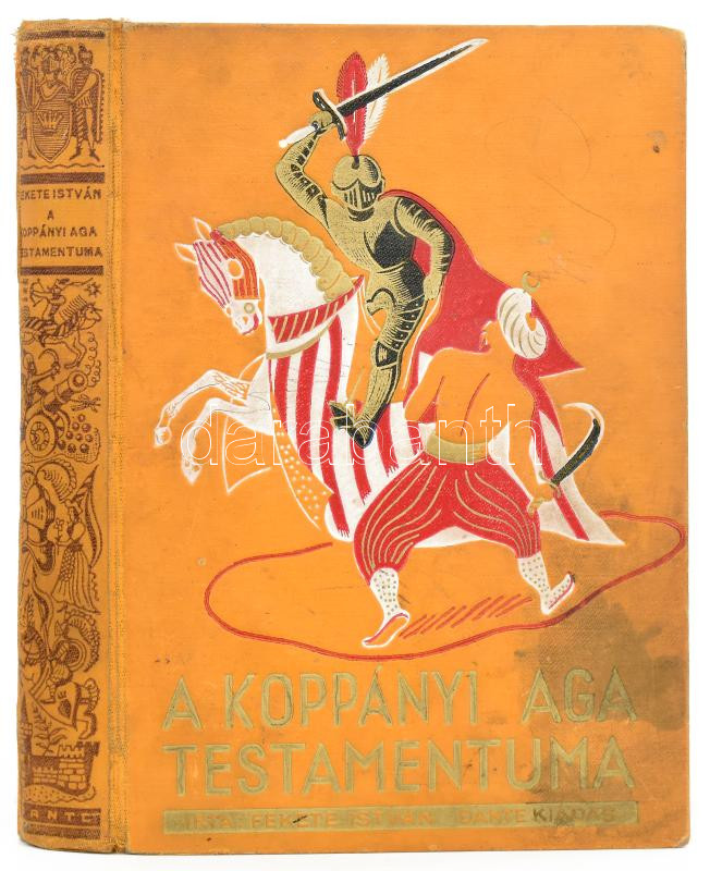 Fekete István: A koppányi aga testamentuma. Kolozsvári Sándor rajzaival. [Bp., 1937], Dante, 166+(2) p. Első kiadás. Kiadói aranyozott, illusztrált egészvászon-kötés, kissé koszos, foltos borítóval, hiányzó címlappal, a hátsó szennylapon kisebb hiánnyal, az utolsó két lapon és a hátsó kötéstáblán tintafolttal.