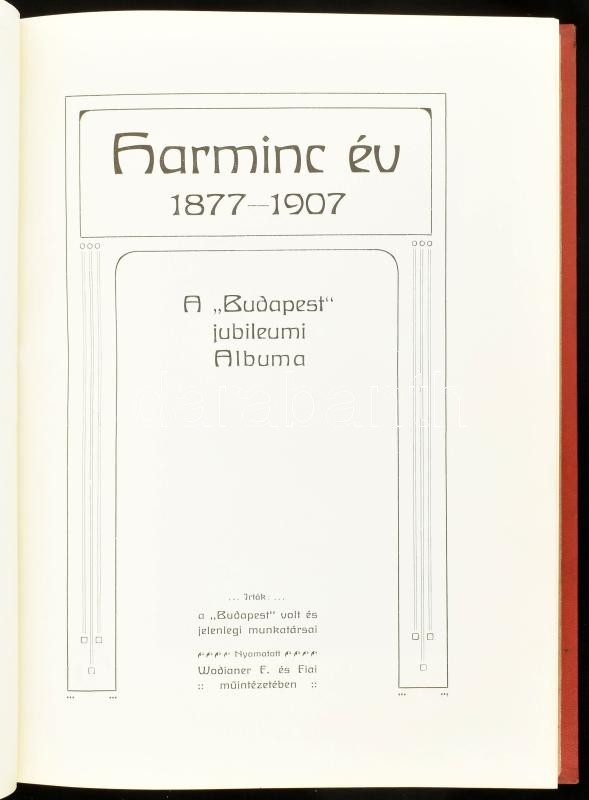 Harminc év 1877-1907. A "Budapest" jubileumi albuma. Írták a "Budapest" volt és jelenlegi munkatársai. Bp.,[1907], Wodianer F. és Fiai Műintézete. Gazdag szövegközti és egészoldalas képanyaggal illusztrálva. Korabeli aranyozott, szecessziós egészvászon-kötésben (Dörner és Heimberg), foltos, kopott borítóval.