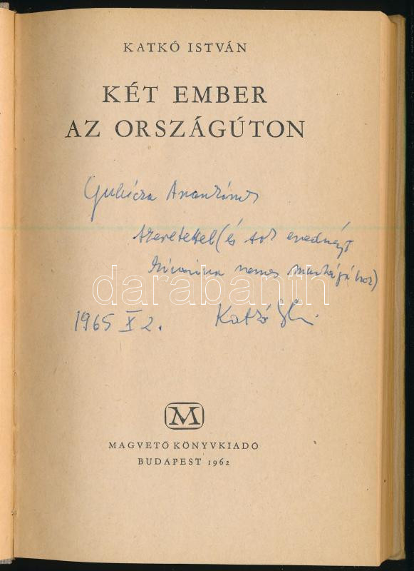 Katkó István: Két ember az országúton. DEDIKÁLT! Bp., 1962, Magvető. K... https://www.darabanth.com/de/466-Fernauktion/466.0/Bucher/Bucher-Andere-kuriositaten~500042/Katko-Istvan-Ket-ember-az-orszaguton-DEDIKALT-Bp-1962-Magveto-Kiadoi-felvaszon-kot~II3142906