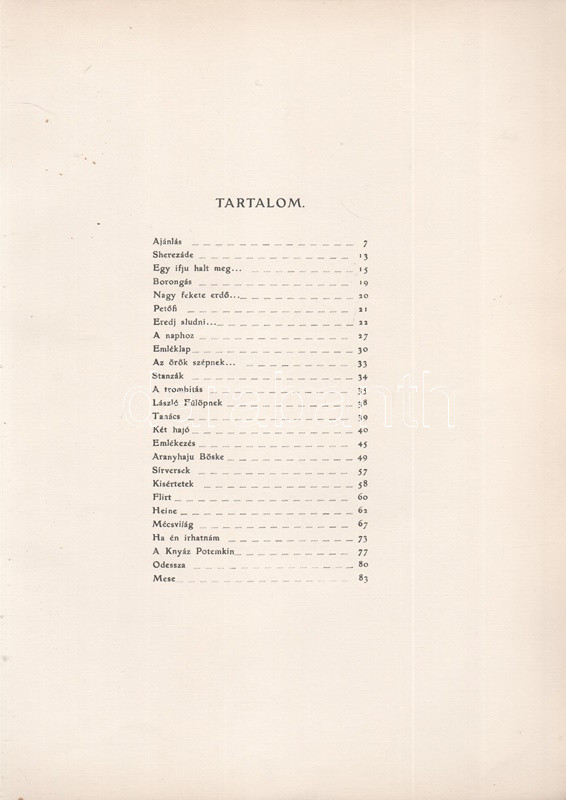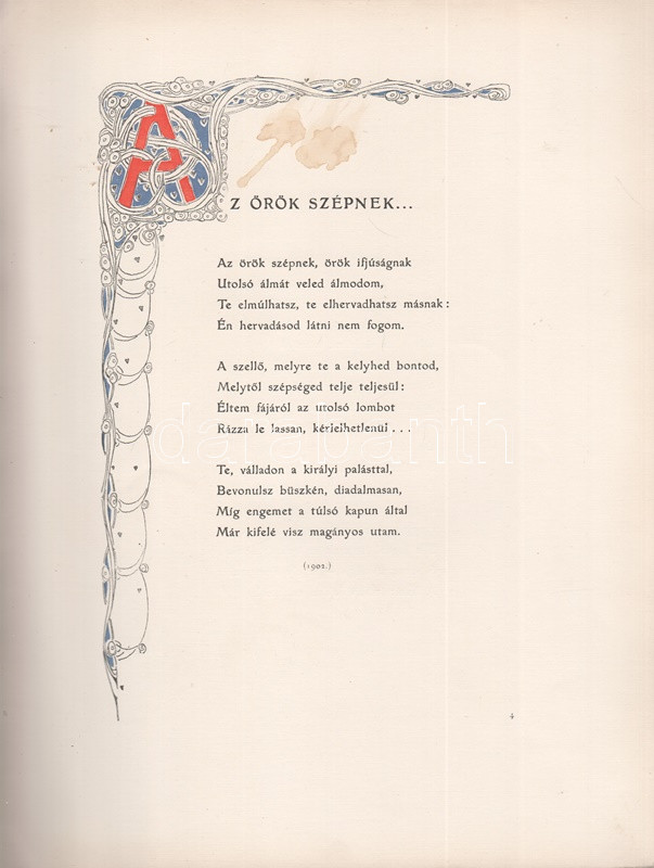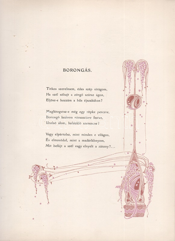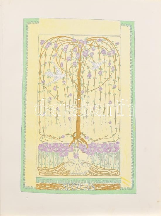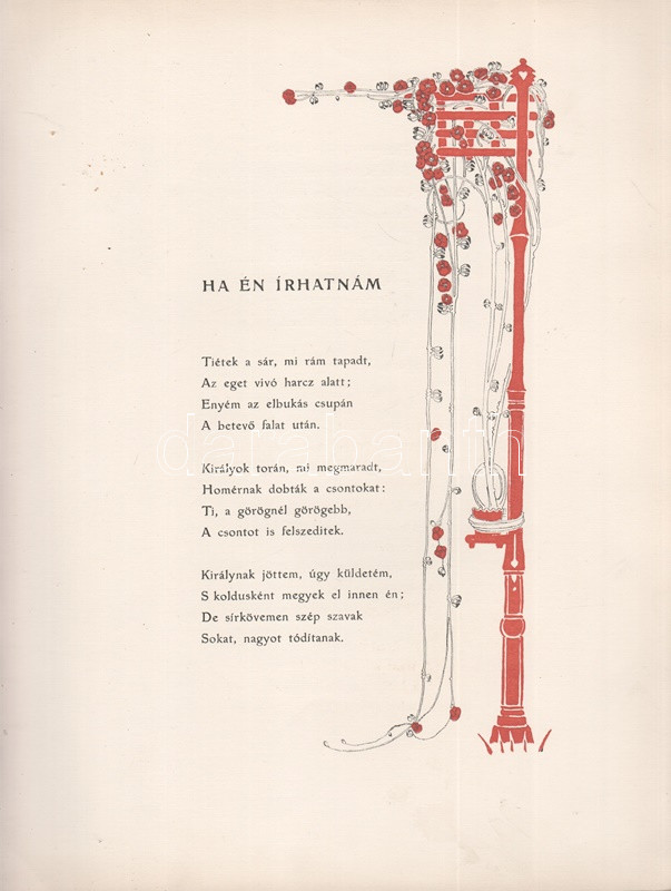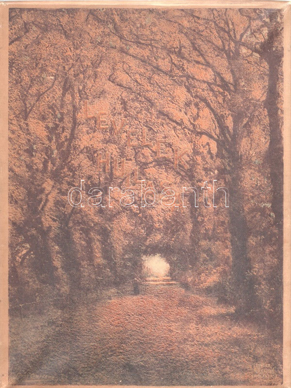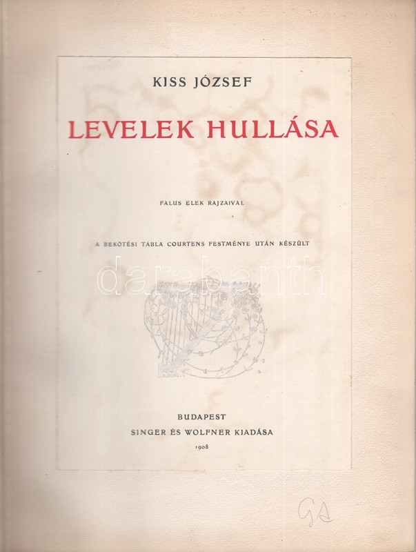 Kiss József: Levelek hullása. Falus Elek rajzaival. [Újabb költemények.] Budapest, 1908. Singer és Wolfner [Franklin ny.] 1 t. (címképen a költő hártyapapírral védett portréja) + [5]-87 + [3] p. Első kiadás. Oldalszámozáson belüli címképen a költő hártyapapírral védett portréja, a verseket Falus Elek nyolc színes, egész oldalas és huszonnyolc szövegközti illusztrációja kíséri. Az első előzéken régi ajándékozási bejegyzés, a címkép verzóján tulajdonosi bélyegzés. Gellér 20.4. Aranyozott, enyhén sérült gerincű kiadói félvászon kötésben, színes, illusztrált első kötéstáblával, amely Courtens egyik festménye után készült. Az egyik legismertebb magyar szecessziós könyv.