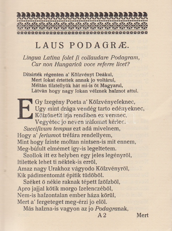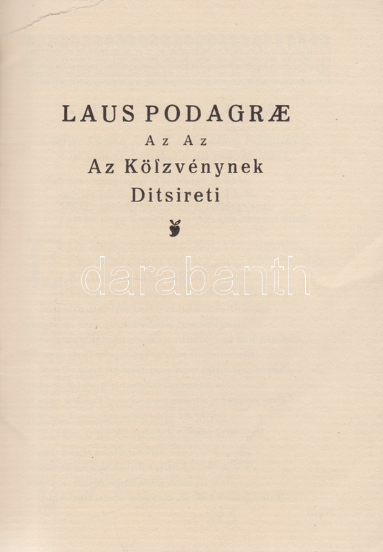 Laus podagrae Az Az Az Köszvénynek Ditsireti. Az utószót írta Turóczi-Trostler József. Kiadta Kner Imre és Turóczi-Trostler József. (Gyoma, 1936. Kner Izidor könyvnyomdája). [18] + 11 + [3] p. Az Országos Széchényi Könyvtár tulajdonában lévő, XVII. századi unikum példányról készült betűhív kiadás. Megjelent 600 példányban, amelyek közül 200 géppel számozott, és a Magyar Bibliophil Társaság tagjai számára készült. Példányunk számozatlan. Lévay-Haiman 1.497. Borda, MM 2, 318. Fűzve, enyhén sérült kiadói borítóban.