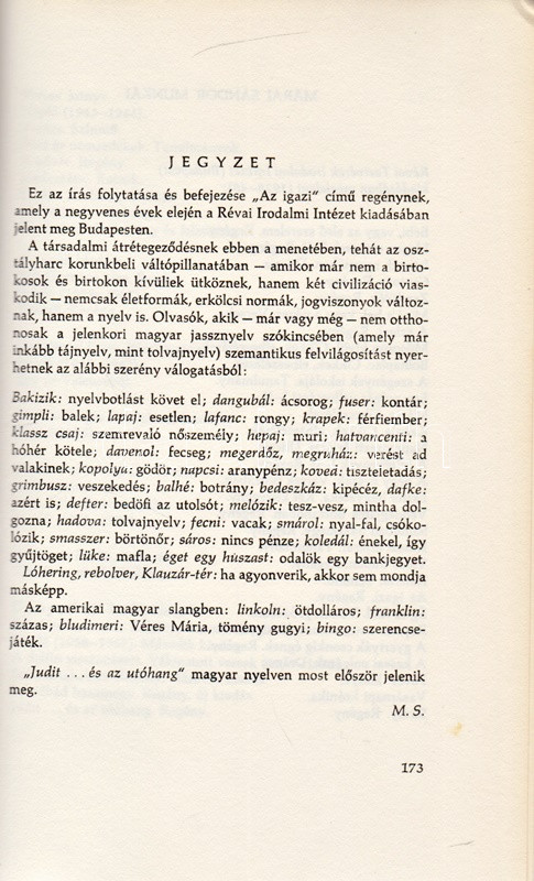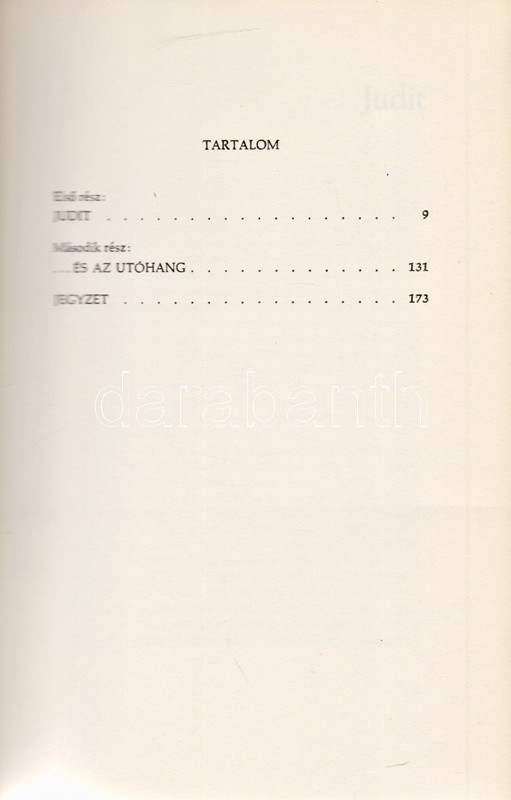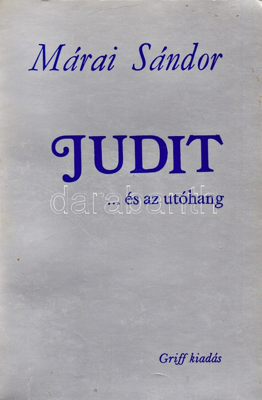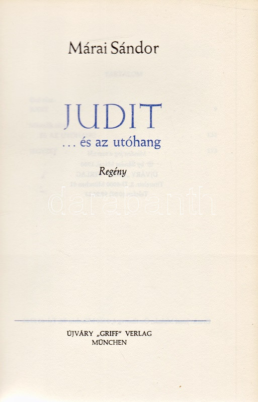 Márai Sándor: Judit... és az utóhang. Regény. (Első kiadás.) München, (1980). Újváry ,,Griff" Verlag (Druck: Josef Molnár). 173 + [3] p. Első kiadás. Márai Sándor Judit... és az utóhang című kötetének két kisregénye az 1941-ben ,,Az igazi..." címmel megjelent Márai-regény cselekményét folytatja. Kötetünk első kisregénye (Judit címmel) nyomtatásban először az Uj Idők folyóirat 1941. évi lapszámaiban jelent meg, a második kisregény kötetünkben jelenik meg először. A tiltott szerző művéről való első hazai recenzió, Rónay László tanulmánya a kis példányszámú katolikus periodika, a Vigilia 1983 januári számában látott napvilágot, ám a kötet első hazai megjelenésére 1992-ig kellett várni. Néhány oldalon apró, halvány foltosság. Mészáros 149. Fűzve, kiadói borítóban. Jó példány.