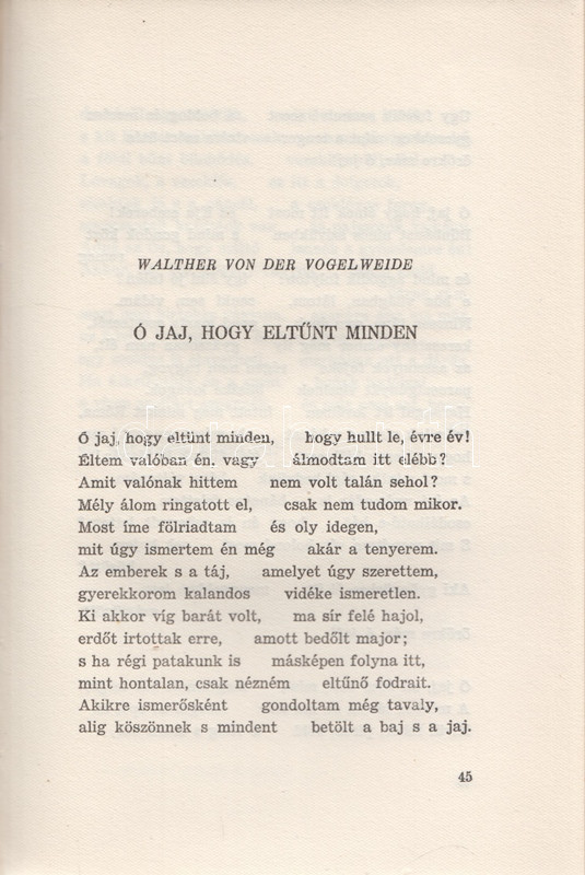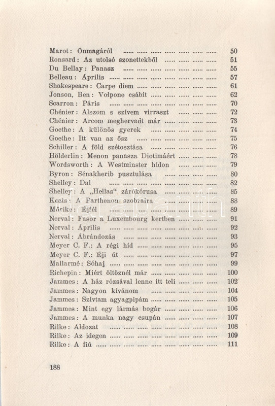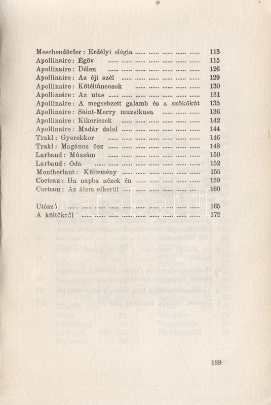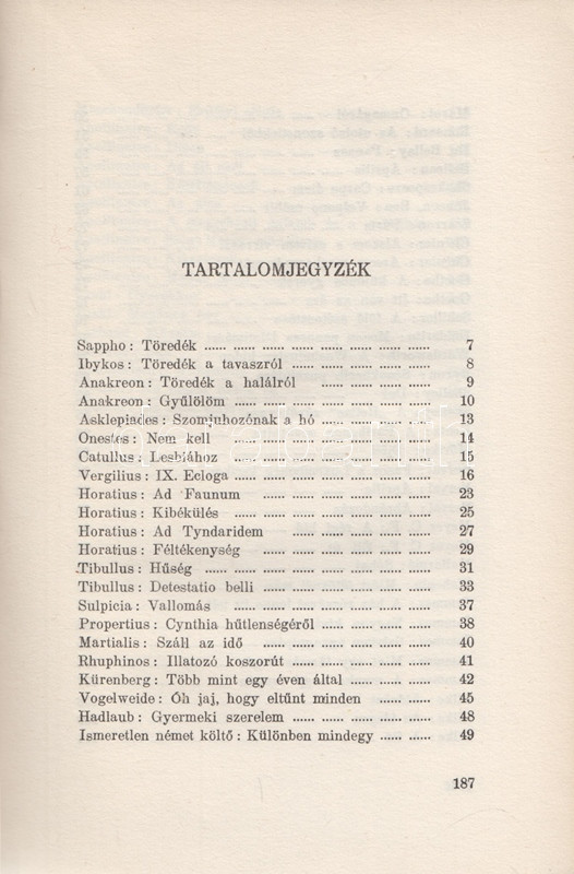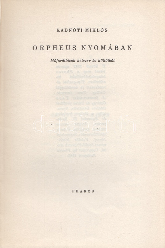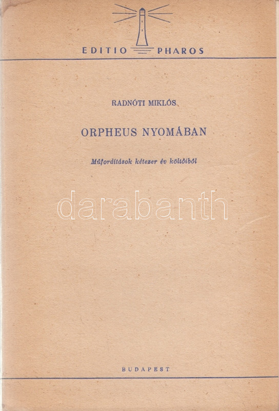 A költő műfordításait egész oldalas, fametszetű költő-portrék kísérik. A kötet végén Radnóti Miklós rövid esszéje műfordítási elveiről. Példányunk fűzése enyhén meglazult.