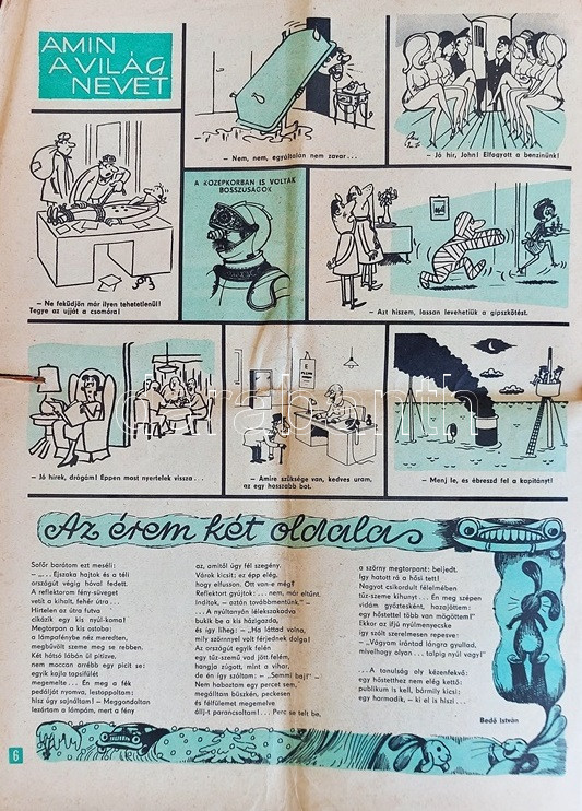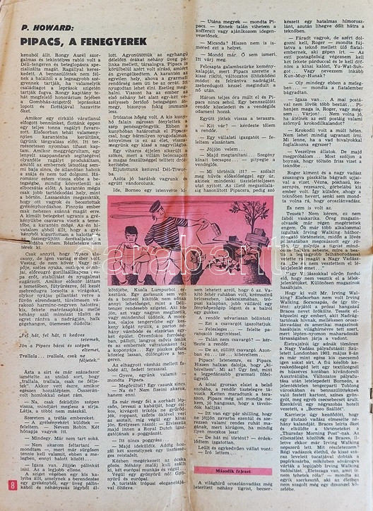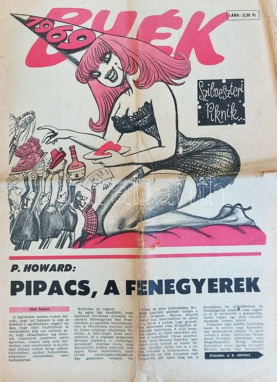 [Rejtő Jenő] P. Howard Pipacs, a fenegyerek. In: Buék 1969! A Magyar Újságírók Országos Szövetségének kiadványa. Szerkesztette Tabi László. (Budapest), [1968]. (Zrínyi ny.) 15 + [1] p. Folio. Az oldalszámozáson belül számos karikatúrát, rajzot tartalmazó szilveszteri kiadvány valódi értéke Rejtő Jenő 1939-ben megjelent ,,Pipacs, a fenegyerek" című művének első újraközlése. Mint az köztudott, Rejtő Jenő a Rákosi-korszakban indexre tett szerző volt, rehabilitása 1956-ban kezdődött, amikor Hegedűs Géza utószavával ismét megjelent A láthatatlan légió. Az alkalmi kiadványunkban megjelenő, hat szövegközti illusztrációval kísért ,,Pipacs, a fenegyerek" két évvel később elnyerte méltó képregényadaptációját is, Gugi Sándor feldolgozásában (Füles, 1970). Jó állapotú lapok, tűzve, hajtogatásnyommal.