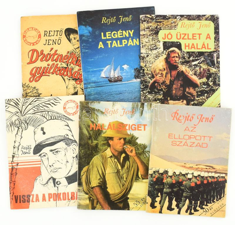 Rejtő kisregény sorozat 6 kötete: Rejtő Jenő: Az ellopott század; Halálsziget; Vissza a pokolba!; Jó üzlet a halál; Legény a talpán; A drótnélküli gyilkosság. Bp., 1988-1990, Göncöl. Kiadói tűzött papírkötés, vegyes állapotban.