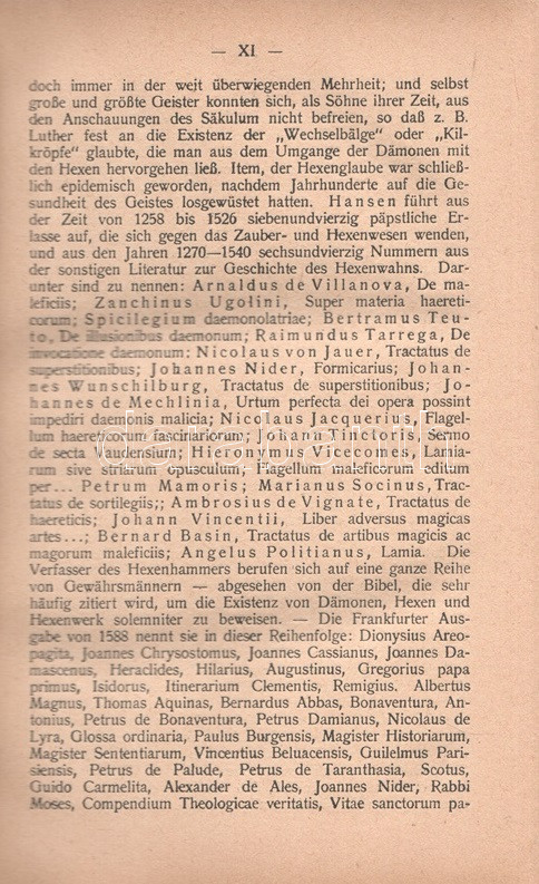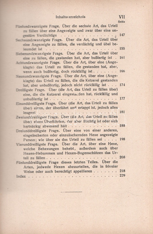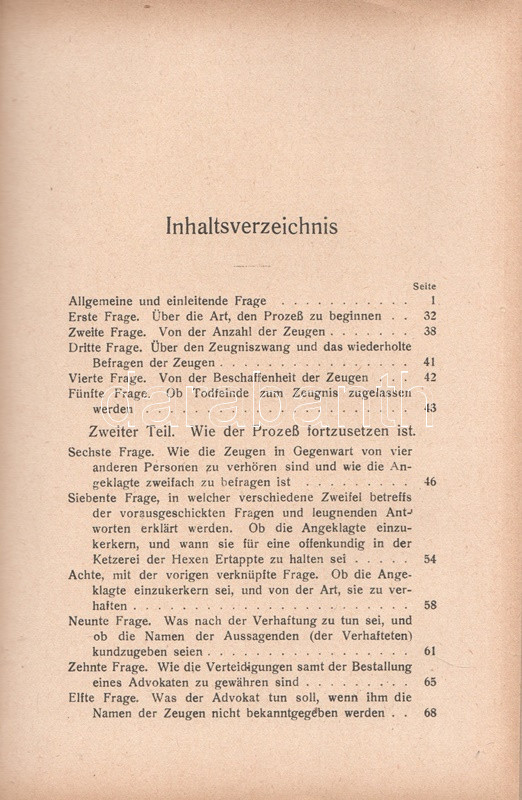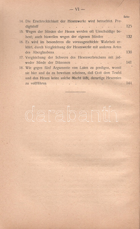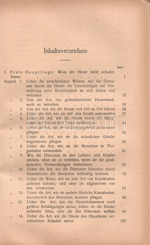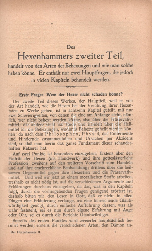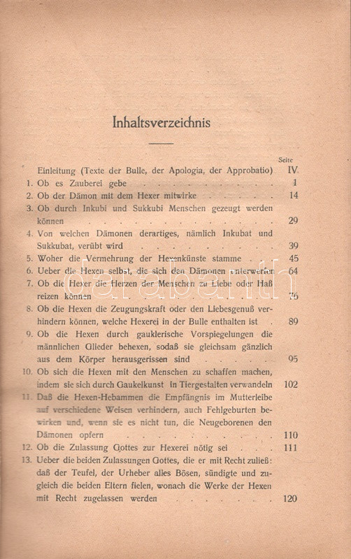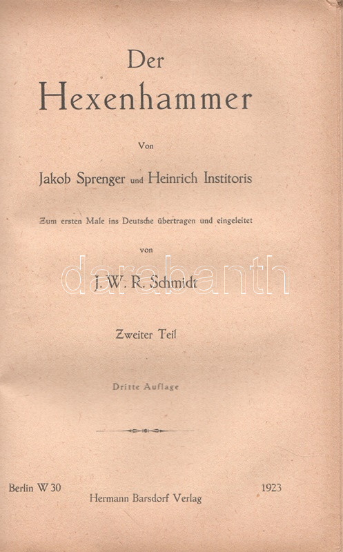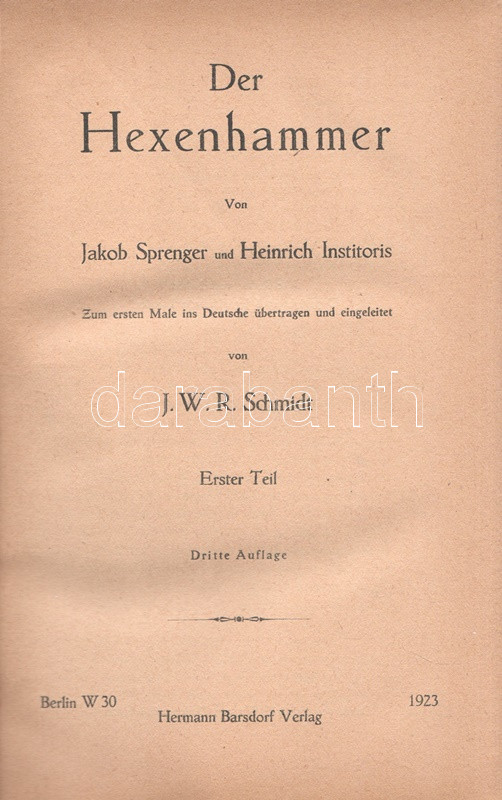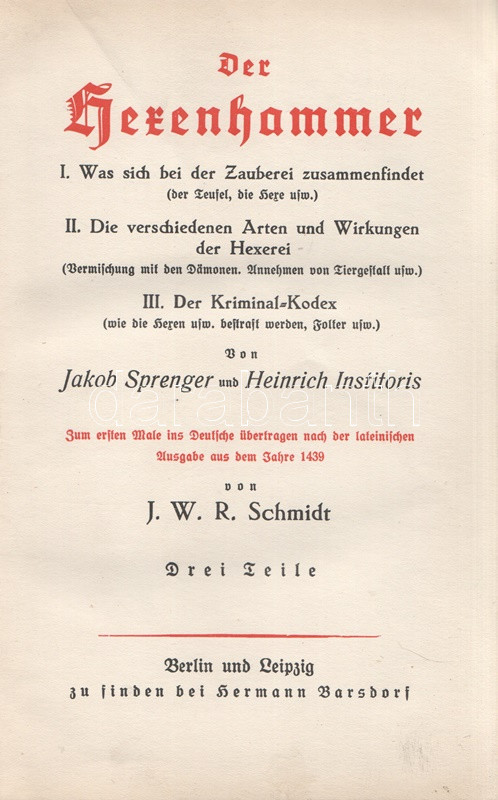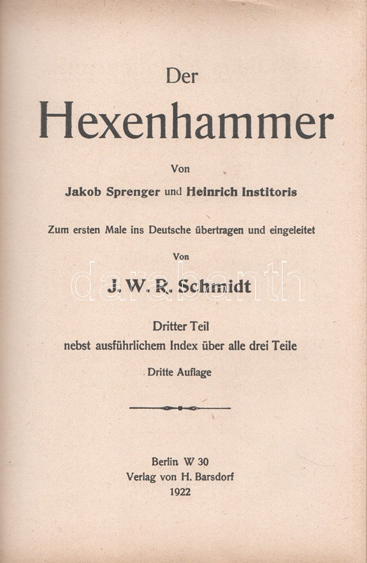 Sprenger, Jakob - Institoris, Heinrich: Der Hexenhammer. (Malleus Maleficarum.) Zum ersten Male ins Deutsche übertragen und eingeleitet von J. W. R. Schmidt. Drei Teile [in Einzelbd.] [I-III. kötet, egybekötve.] Erster Teil: Was sich bei der Zauberei zusammenfindet. 1. Der Teufel. 2. Der Hexer oder die Hexe. 3. Die göttliche Zulassung. -- Zweiter Teil: Die verschiedenen Arten und Wirkungen der Hexerei und wie solche wieder behoben werden können. -- Dritter Teil: Der Kriminal-Kodex: Über die Arten der Ausrottung oder wenigstens Bestrafung durch die gebührende Gerechtigkeit vor dem geistlichen oder weltlichen Gericht. Index über alle drei Teile. Dritte Auflage. Berlin, 1922-1923. Hermann Barsdorf Verlag (Druck von Friedrich Wagner, Duderstadt i. Hann). XXXIV + [1] + 151 + [1] p.; [6] + 190 + [2] p.; VII + [1] + 247 + [1] p. A hírhedt démonológiai kézikönyv, a késő középkorban keletkezett boszorkányvadász traktátus a Tirolban működő, és onnan a helyi püspök által kitiltott Heinrich Kramer (Heinrich Institoris) német klerikus latin nyelvű műve, első kiadása ,,Malleus Maleficarum" címmel 1486-ban, Speyerben jelent meg. A traktátus 1519-től megjelenő kiadásaiban már Jacob Sprenger dominikánus szerzetes is szerepel szerzőként. Jóllehet az inkvizíció nem ismerte el hivatalos kézikönyvként, és igen komoly teológiai kifogásai voltak a munka ellen, a munka Európa számos reneszánsz udvarában komoly figyelmet keltett, és rengeteg kiadásának betudhatóan komoly hatást gyakorolt az 1560 és 1630 között kibontakozó boszorkányüldözésre, mely katolikus és protestáns földeken egyaránt dívott. A Malleus Maleficarium szövegének német fordítása előtt alapos irodalomtörténeti tanulmány. Ackermann I, 699. Kiadói egészvászon kötésben, gerincén feliratozott címkével, az eredeti borítók bekötve. Jó példány.