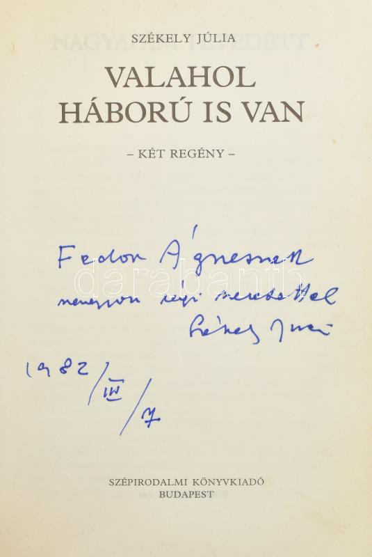 Székely Júlia: Valahol háború is van. Két regény. A szerző, Székely Júlia által Fedor Ágnes (1909-1990) magyar író, újságíró részére DEDIKÁLT példány. Bp., 1982., Magvető. Kiadói egészvászon-kötés, kiadói papír védőborítóban.