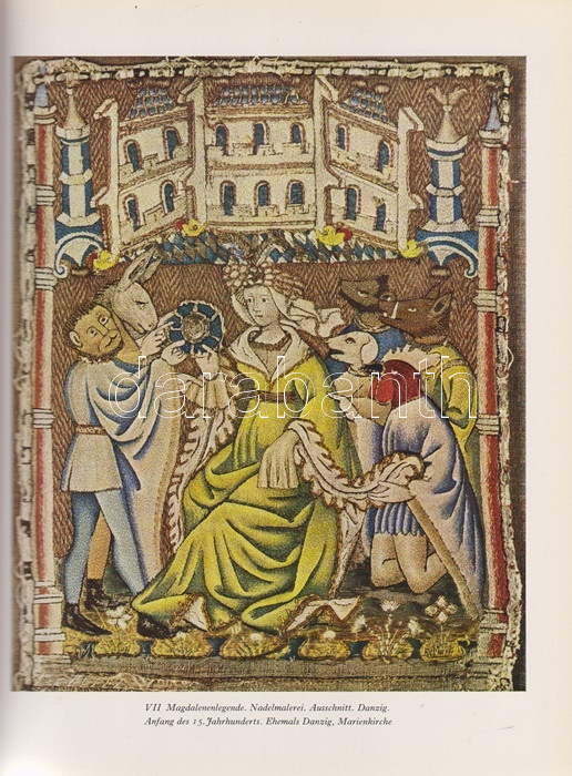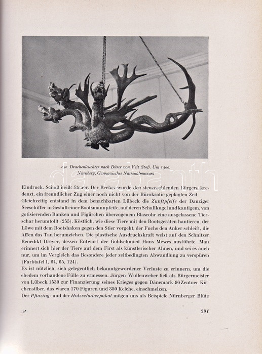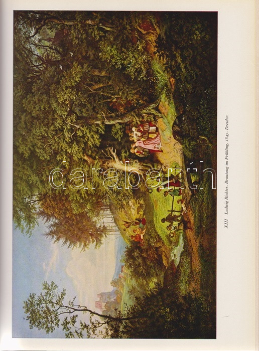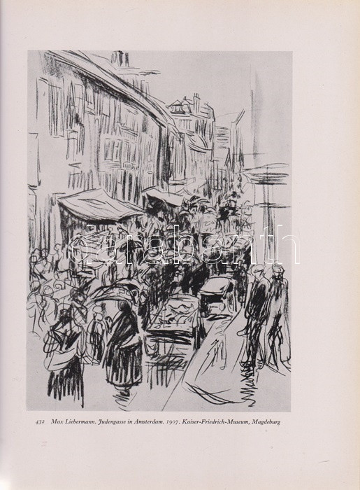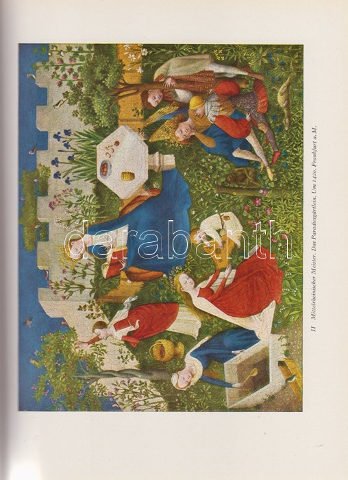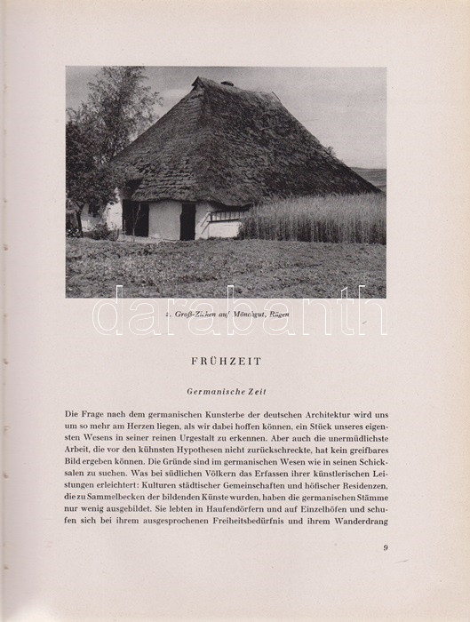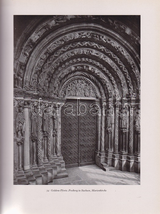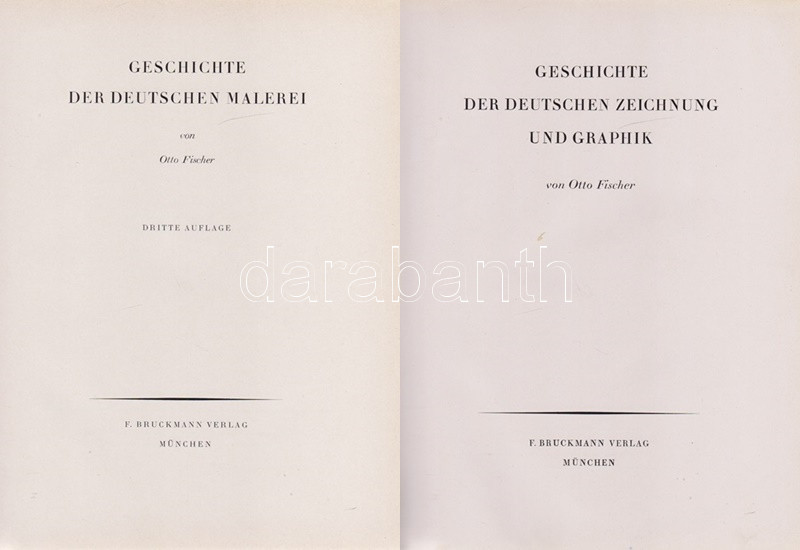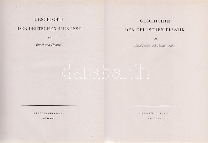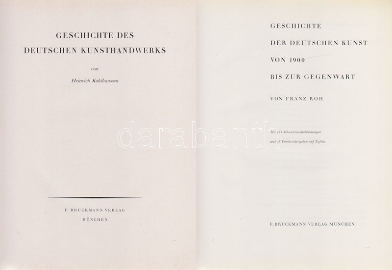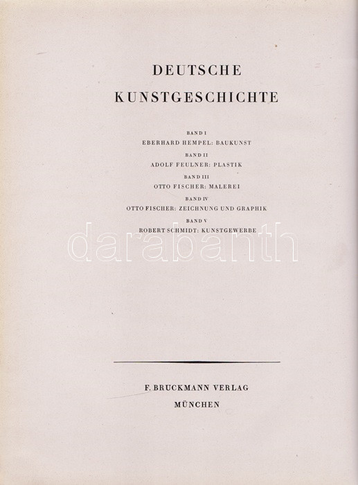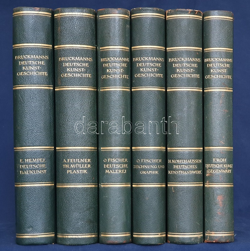 Deutsche Kunstgeschichte. Band I-VI. [Teljes.] München, 1949-1958. F. Bruckmann Verlag (Graph. Kunstanstalten F. Bruckmann) 588 p. + 8 t. (színes); 655 + [1] p. + 12 t. (színes); 494 + [2] p. + 16 t. (színes); 528 p. + 16 t. (színes); 591 + [1] p. + 16 t. (színes); 478 + [2] p. + 38 t. (színes, 19 kétoldalas táblán). Egyetlen kiadás. A sorozat részei: Band I: Eberhardt Hempel: Geschichte der Deutsche Baukunst. - Band II: Adolf Feulner, Theodor Müller: Geschichte der Deutschen Plastik. - Band III: Otto Fischer: Geschichte der Deutsche Malerei. (Dritte Auflage.) - Band IV: Otto Fischer: Geschichte der Deutschen Zeichnung und Graphik. - Band V: Heinrich Kohlhaussen: Geschichte der Deutschen Kunsthandwerks. - Band VI: Franz Roh: Geschichte der Deutschen Kunst von 1900 bis zur Gegenwart. Oldalszámozáson belül egész oldalas és szövegközti képekkel gazdagon illusztrált művészettörténeti munka, mely a tágabb értelemben vett németországi képzőművészet valamennyi ágával foglalkozik. A munka öt kötetben mutatja be ki a német építészet, szobrászat, festészet, grafika, a német bútor-, textil-, kerámia- és üveg-, fém- és ötvösművészet tizenegy évszázadának remekeit, a Karoling kortól a XX. század elejéig, majd a hatodik kötetben - mintegy pótolandó a korábbi kötetek hiányait - bemutatja a festészet, szobrászat avantgárd korszakát, illetve az építészet és a belsőépítészet modernista történetét. Egységes, aranyozott gerincű, korabeli félmaroquin kötésben, három kötet gerincén felül apró sérülés, a zárókötet gerincén apró kopás. Szép sorozat.