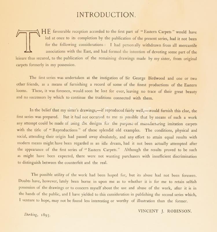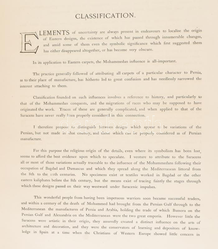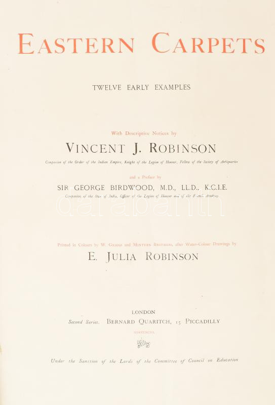 Eastern Carpets. Twelve early examples. With descriptive notices by Vincent J. Robinson, and a preface by Sirg George Birdwood. Printed Colours by W. Griggs and Mintern Brothers, after water-colour drawings by E. Julia Robinson. Second series. London, 1893, Bernard Quaritch, 14 sztl. lev.+11 (kromolitográfiák 12 illusztráció 11 táblán) t. Angol nyelven. Kiadói kemény-kötés, kopott, foltos borítóval, a kötéstáblák leváltak, a gerince sérült, az elülső szennylap levált, a hátsó szennylapon kis lapszéli szakadásokkal, 52x38 cm. / Eastern Carpets. Twelve early examples. With descriptive notices by Vincent J. Robinson, and a preface by Sirg George Birdwood. Printed Colours by W. Griggs and Mintern Brothers, after water-colour drawings by E. Julia Robinson. Second series. London, 1893, Bernard Quaritch, 14 leaves. + 11 (chromolithographies, 12 illustrations on 11 tables) t. In English language. Hardcover, with worn and spotty cover, with damaged cover and spine: the covers and the front endsheet are separated from the spine, the back endsheet is slightly damaged, 52x38 cm.