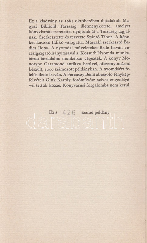 Ferenczy Béni: A könyvillusztrálásról. Rövid előadás. (Számozott.) Budapest, 1986. Magyar Bibliofil Társaság (Kossuth Nyomda). 45 + [1] p. Egyetlen kiadás. Összesen 1000 példányban megjelent, könyvárusi forgalomba nem került bibliofil kiadvány számozott példánya. Kolofon: ,,Ez a kiadvány az 1985 októberében újjáalakult Magyar Bibliofil Társaság illetménykötete, amelyet könyvbaráti szeretettel nyújtunk át a Társaság tagjainak. Szerkesztette és tervezte Szántó Tibor. A képeket Laczkó Ilona válogatta. Műszaki szerkesztő Badics Ilona. A nyomdai műveleteket Bede István vezérigazgató irányításával a Kossuth Nyomda munkatársai társadalmi munkában végezték. A könyv Monotype Garamond antikva betűvel, ofszetnyomással készült, 1000 számozott példányban. [...] Ez a 426. számú példány". Oldalszámozáson belül számos egész oldalas illusztrációval. Aranyozott kiadói kartonkötésben, aranyozott, illusztrált kiadói védőborítóban. Jó példány.
