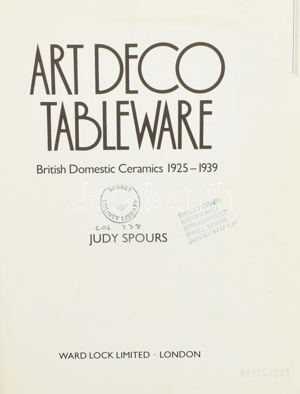 Judy Spours: Art deco tableware (Art deco étkészletek). London, 1988, Ward Lock, kiadói műbőr kötés, első lapján könyvtári ragaszokkal, angol nyelven. Gazdag képanyaggal illusztrált kiadvány az art deco étkészletekről.