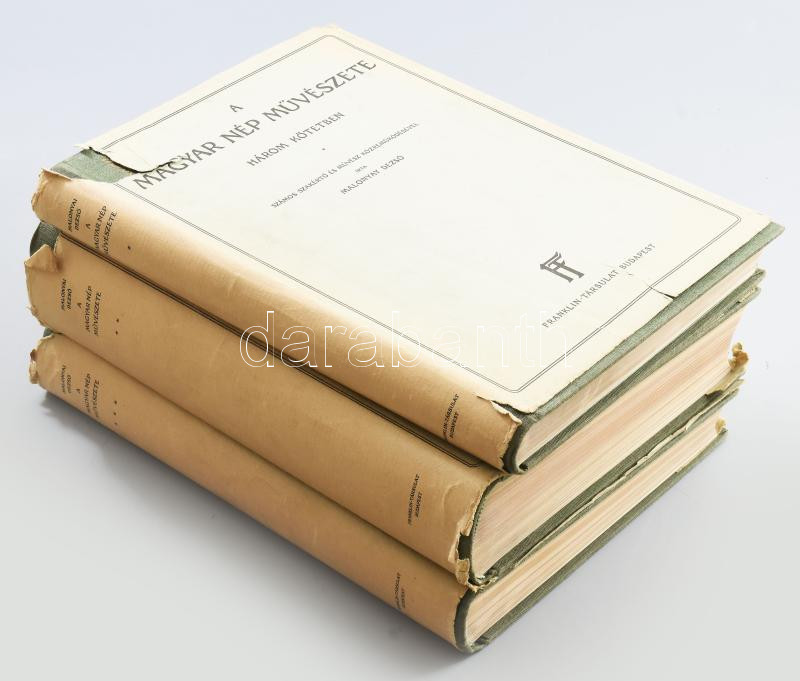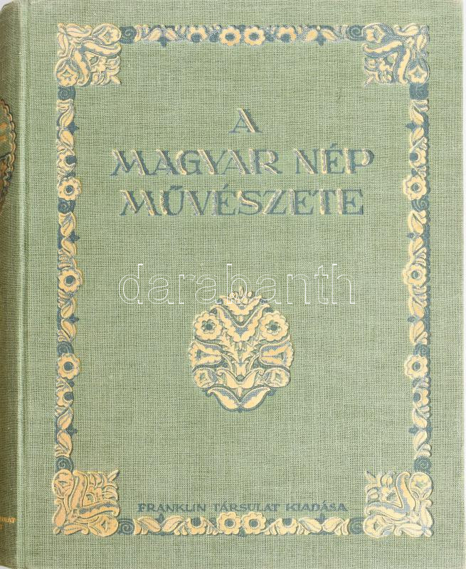 Malonyay Dezső: A magyar nép művészete I-III. köt. Három kötetben. Számos szakértő és művész közreműködésével írta:- -. I. köt. A Balatonmelléke.; II. Bakonytól a Tolnamegyei Sárközig.; III. A palócokról.; Bp.,[1911-1912]. Franklin,2+304 p.+ XXI (színes képek) t.; 2+370 p.+XLVI (színes képek) t.+76 (fekete-fehér képek) t.; 2+333 p.+XXIV (színes képek) t.+52 (fekete-fehér képek) t. Számos egészoldalas és szövegközti képpel illusztrált. Egységes kiadói, dúsan aranyozott, illusztrált, egészvászon kötésben, kiadói papír védőborítóban, a papírborító szakadt, sérült, de egyébként szép állapotban. A papír védőborítós példány rendkívül ritka!