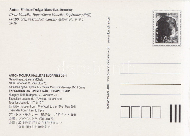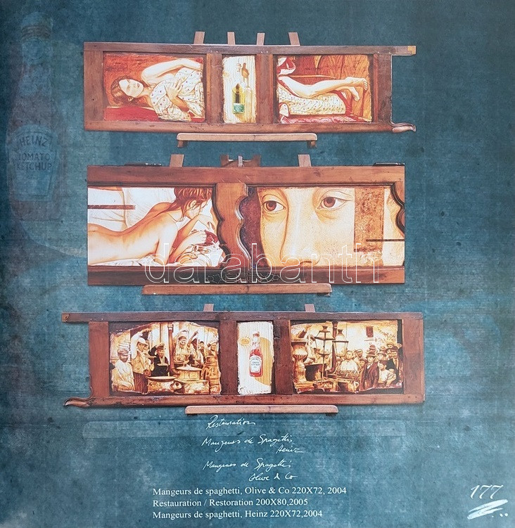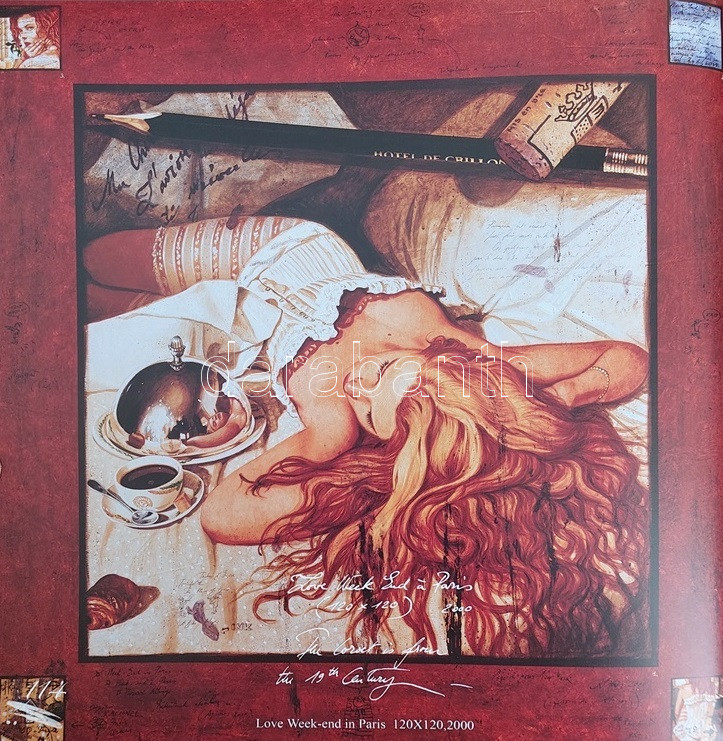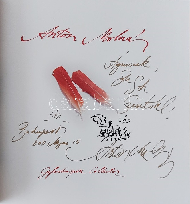 Molnar, Anton [Molnár Antal]: Anton Molnar Gefrodinspex Collector. (Molnár Antal festőművész képzőművészeti albuma.) [Dedikált.] [Tokió] Tokyo, 2007. Prova Publishing (Hang Tai Printing Company Ltd., Hong Kong). 199 + [7] p. Folio. Egyetlen kiadás. Rajzos dedikáció: ,,Ágnesnek sok-sok szeretettel! Budapest, 2011 május 15. Anton Molnar". Anton Molnar (sz. 1957) Párizsban élő magyar festőművész, főiskolai tanár, legsikeresebb külföldi képzőművészeink egyike. Sajátos montázstechnikájú, a németalföldi festészetből és az op-artból egyaránt merítő művészete méltósággal ünnepli az életörömöt, a női testet és az ezredforduló sajátos tárgyi világát. A döntően angol nyelven feliratozott képzőművészeti album végén a képzőművész jelentősebb tárgyainak jegyzéke, illetve az albumban felhasznált festmények listája. Anton Molnár gyakran jár hazájában is, a kötetben elhelyezett színes képeslap, egy budapesti Molnár-tárlat aprónyomtatványa arra utal, hogy a dedikáció a művész 2011. április 17. és 2011. május 15-e között megtartott budapesti tárlata alkalmából született. Színes, illusztrált kiadói kartonkötésben. Hibátlan, olvasatlan példány, illetve tökéletes állapotú lap.