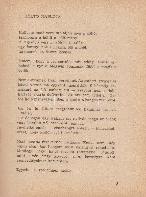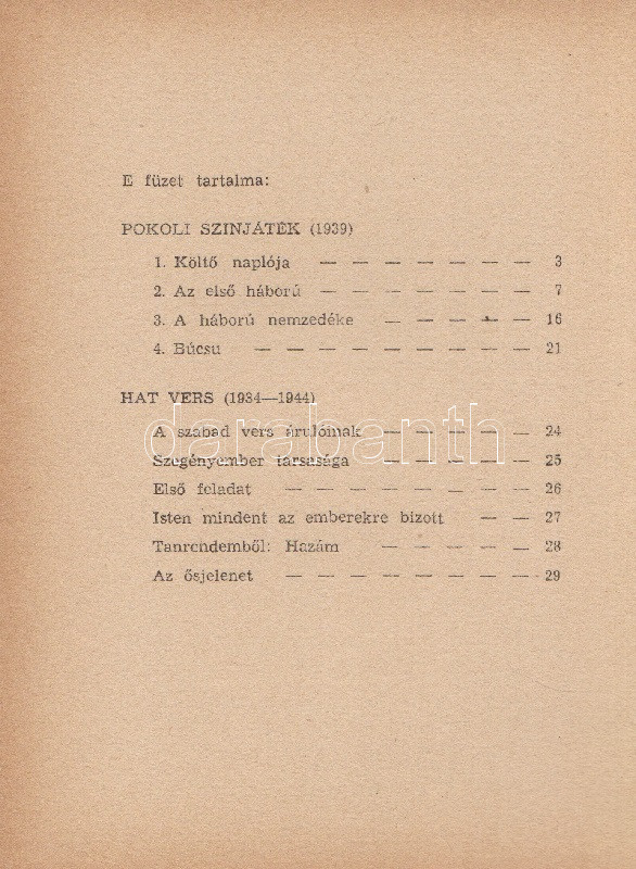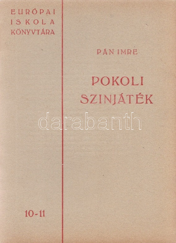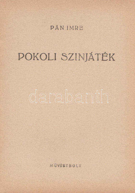 Pán Imre: Pokoli színjáték. [Versek.] (Budapest), [1947]. Művészbolt (Máté ny.) 31 + [1] p. Egyetlen kiadás. Pán Imre (eredetileg Mezei Imre) avantgárd művészeti író (IS, Dokumentum, Munka, Ma), szervező, szerkesztő, Kassák Lajos munkatársa, a Sztárbolt, 1945-től Művészbolt néven ismert Andrássy úti könyvesbolt vezetője, az 1945-1948 között fennállt szürrealista művészcsoport, az Európai Iskola alapítója. Művészboltjában Pán Imre avantgárd kiállításokat szervezett. Kötetében a Pokoli színjáték című szabad versben írott hosszúversét, illetve hat rövidebb költeményét adja közre. (Európai Iskola könyvtára 10-11.) Fűzve, kiadói papírborítóban. Nagyon ritka.