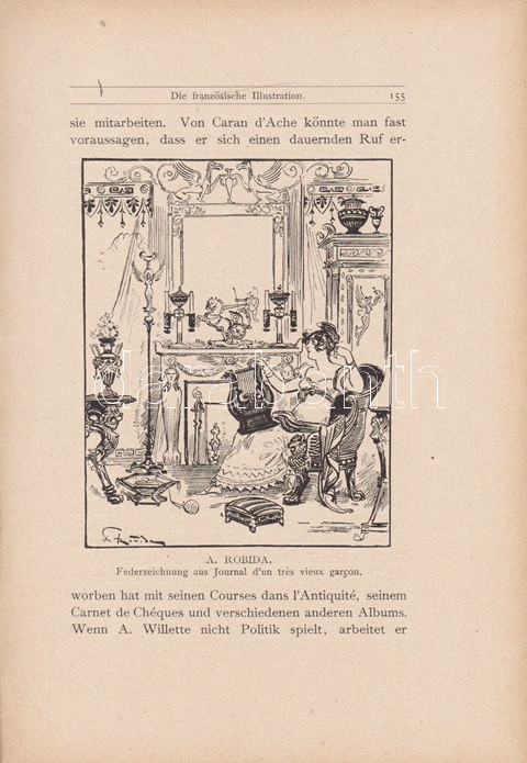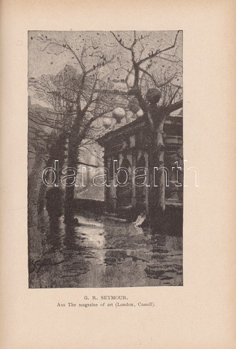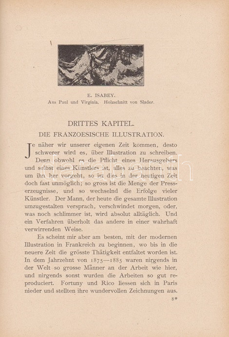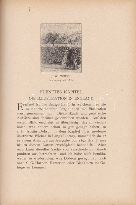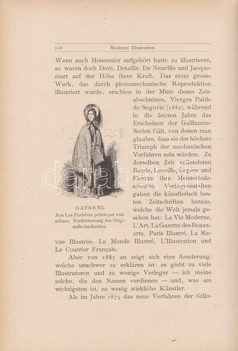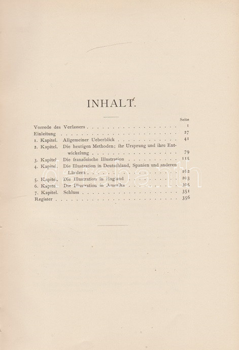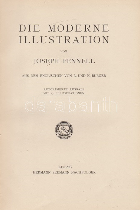 Pennell, Joseph: Die moderne Illustration von Joseph Pennell. Aus dem Englischen von L. und K. Burger. Autorisierte Ausgabe mit 170 Illustrationen. Leipzig, [1901]. Hermann Seemann Nachfolger (Gedruckt bei E. Haberland). XV + [1] + 362 + [6] p. Oldalszámozáson belül 170 illusztrációval (fametszetek, kőnyomatok, tollrajzok vegyesen) melyekből 104 egész oldalas. Minden illusztráció technikája és forrása nevesítve a kötet elején közölt mutatóban. Tartalma: Allgemeiner Überblick. - Die heutigen Methoden, ihr Ursprung und ihre Entwicklung. - Die französische Illustration. - Die Illustration in Deutschland, Spanien und anderen Ländern. - Die Illustration in England. - Die Illustration in Amerika. Festett, aranyozott, illusztrált kiadói egészvászon kötésben (Wilh. Kämmerer Buchbinderei, Berlin), felül vörös festésű lapszélekkel. Szép példány.